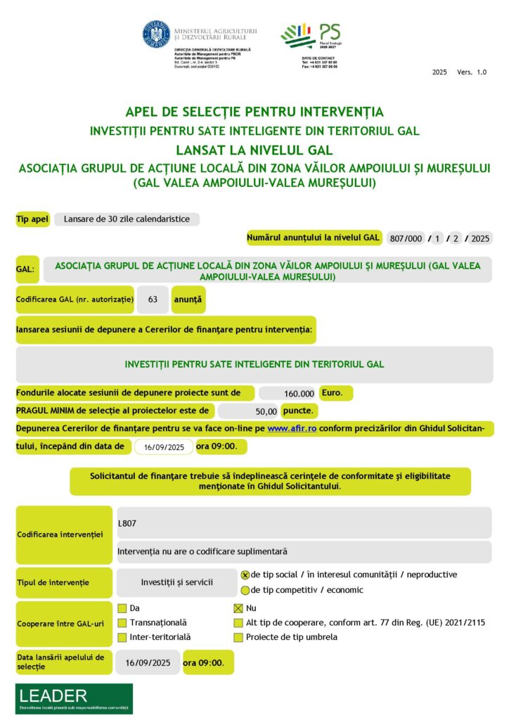 Asociația Grupul de Acțiune Locală din Zona Văilor Ampoiului și Mureșului anunță lansarea sesiunii de depunere a cererilor de finanțare pentru intervenția sprijin pentru înființarea de activități non-agricole în teritoriul GAL începând din data de 16.09.2025.