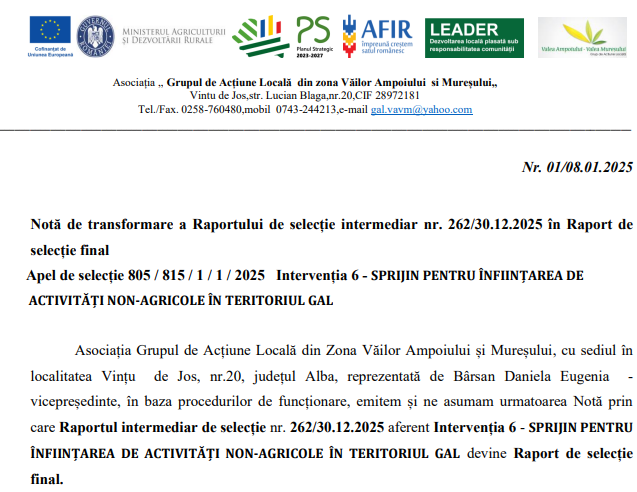 Asociația „Grupul de Acțiune Locală din Zona Viilor Ampoiului și Mureșului” anunță publică transformarea Raportului intermediar de selecție nr. 262/30.12.2025 în Raport de selecție final pentru Intervenția 6 – SPRIJIN PENTRU ÎFIINȚAREA DE ACTIVITĂȚI NON-AGRICOLE ÎN TERITORIUL GAL.