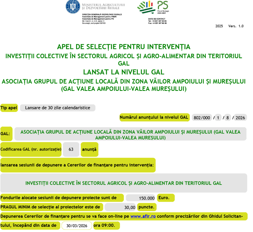 Asociația Grupul de Acțiune Locală din Zona Văilor Ampoiului și Mureșului anunță lansarea sesiunii de depunere a proiectelor pentru intervenția L802. Această sesiune vizează investițiile colective menite să consolideze formele asociative și lanțurile scurte de aprovizionare din teritoriul GAL.